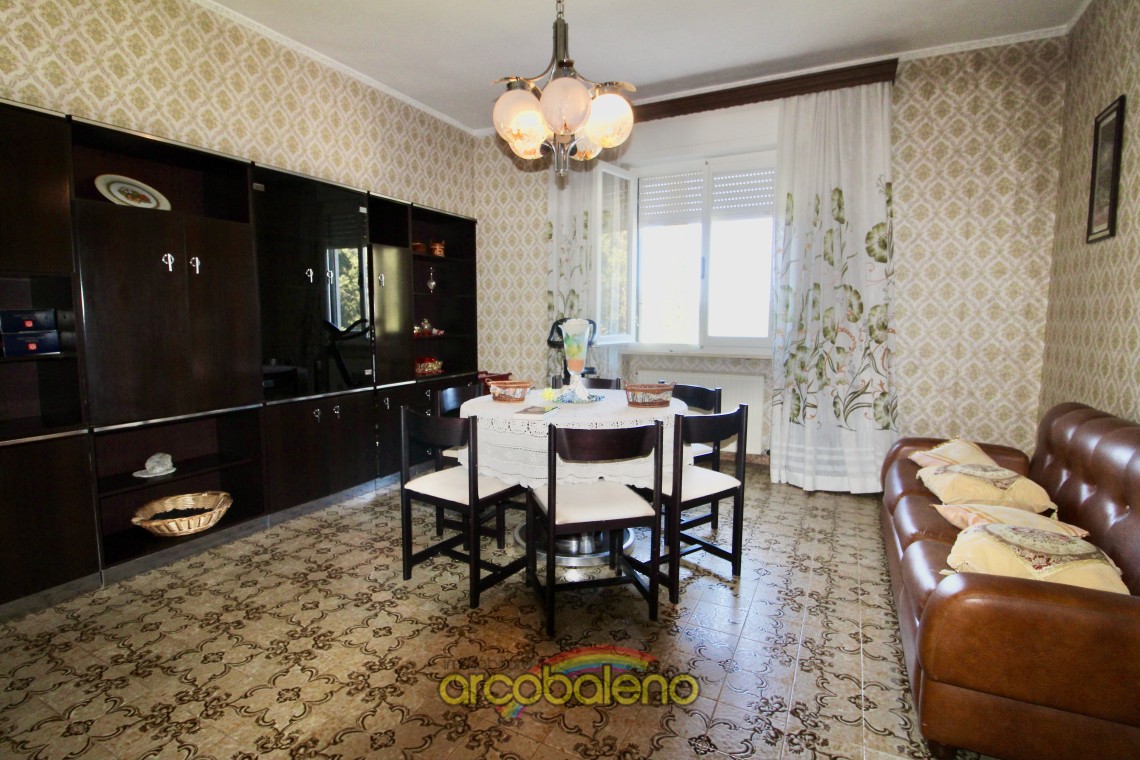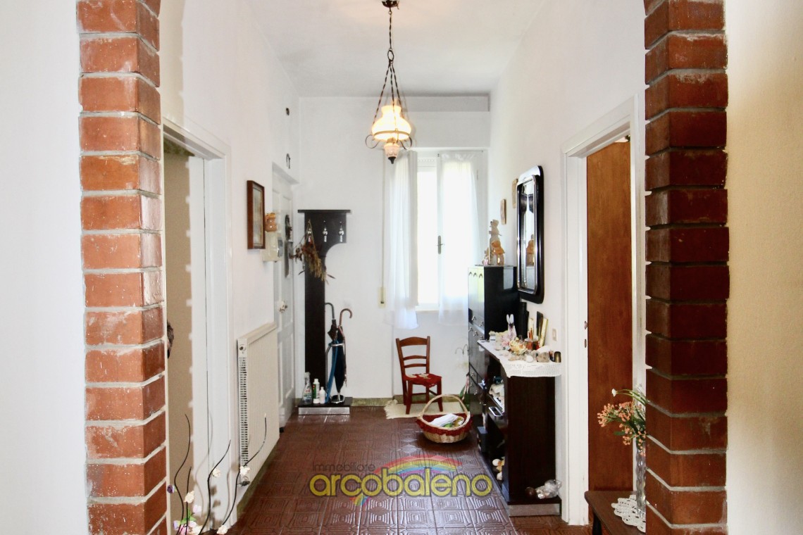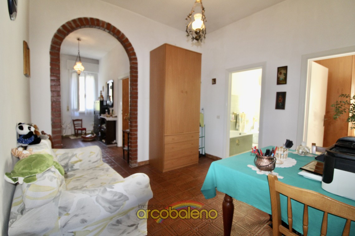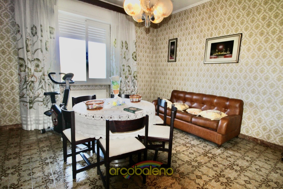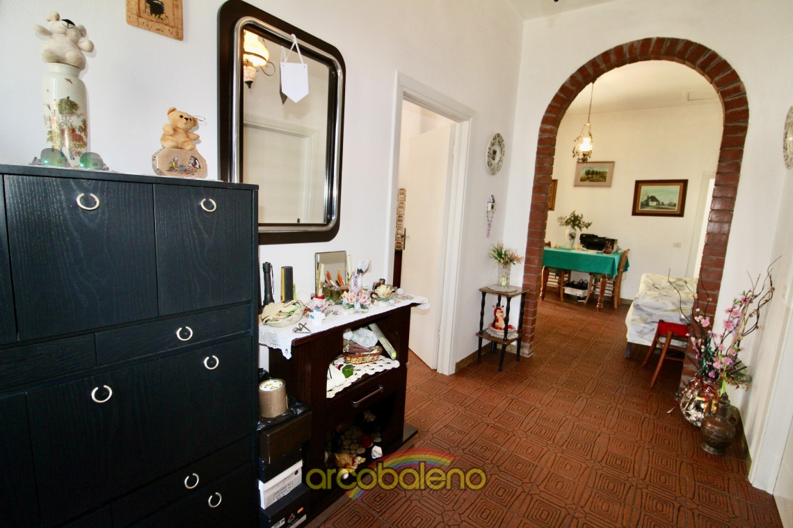 L'appartamento ha una superficie di mq 130 composto da ingresso , cucina dalla quale si accede ad piccolo balcone dove si trova un ripostiglio esterno , sala da pranzo ; un arco in pietra nel corridoio divide la zona giorno dalla zona notte che è composta da due ampie camere matrimoniali , una camerina ed il bagno.